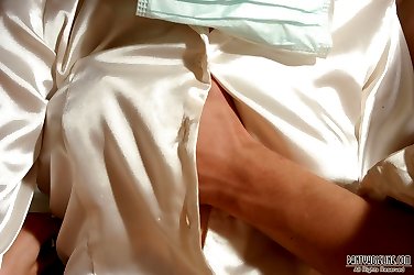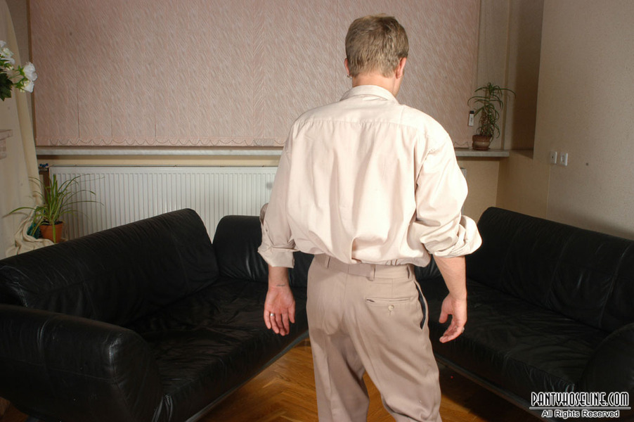 Pantyhosed babe teasing guy with her upskirt look before going down on him